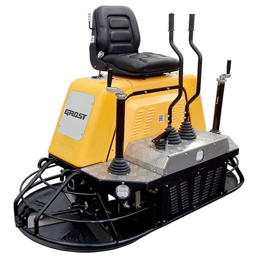 Затирочная машина двухроторная бензиновая Grost ZMD-1000 - это стандартная двухроторная затирочная машина управляется сидящим на ней оператором. Машина укомплектована мощным бензиновым двигателем HONDA GX690 мощностью 22,1 л.с. (16,5 кВт) с электрическим запуском. Безопасная и удобная машина с функцией определения присутствия оператора - не надо постоянно держать зажатой педаль при работе, при отсутствии оператора в кресле машина выключается. Пластиковые элементы корпуса обеспечивают привлекательный внешний вид и в отличие от металлических корпусов не ржавеют. Применение: Предназначена для механизированного заглаживания и затирки бетонных полов и покрытий на больших площадях. Машина оснащена механизмом регулировки угла наклона лопастей и применяется на всех этапах заглаживания и затирки. Затирочный диск съемный и крепится на лопастях при помощи кронштейнов. Производитель дает гарантию на все оборудование сроком 1 год.